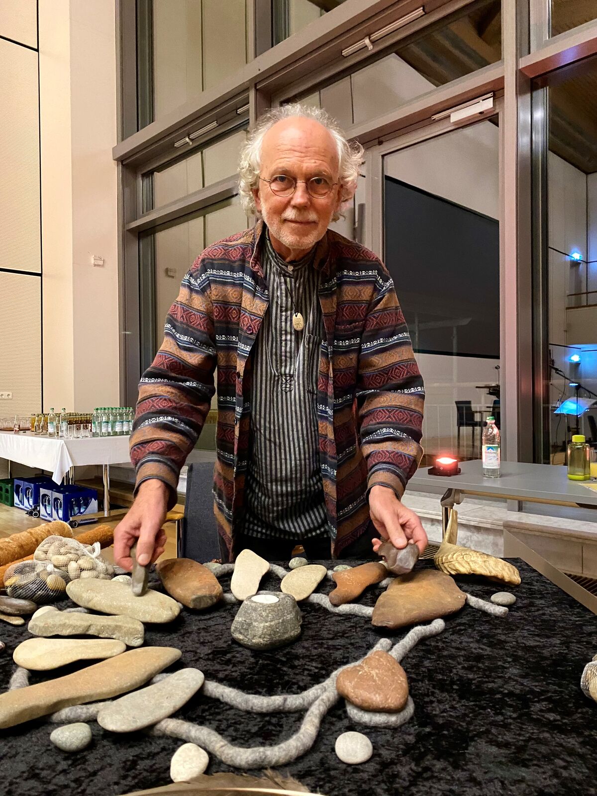 Dazu begleitete einfühlsam der Steinmusiker Michael Ranftl, der die Seele der Steine zum Klingen brachte. Ganz still wurde es im Saal, als er auf seiner Gitarre das Gedicht unseres kürzlich verstorbenen Hans Schütz „Panta rhei, alles im Fluss“ zu Gehör brachte. So manche Hand der Besucher strich über sein Steinxylophon aus Lechkieseln, denen er kunstvoll Töne entlockte.