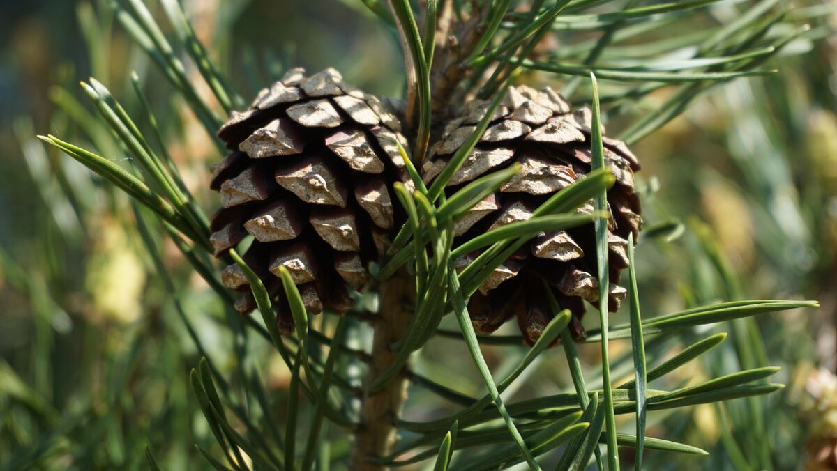 Nadeln: Bis 8 cm lang, graugrün bis blau/ grün und kurz zugespitzt, in Zweierbündeln