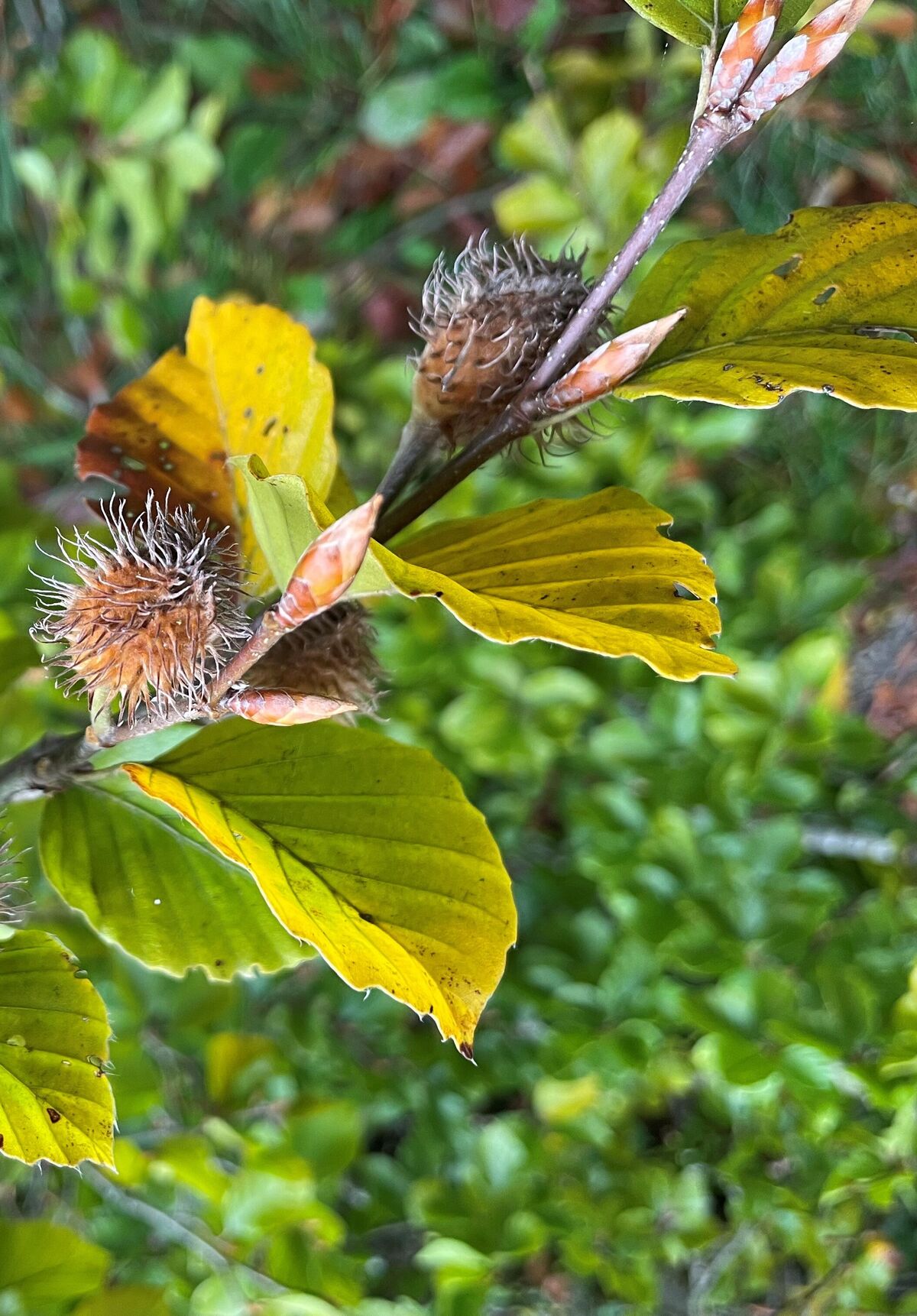 Blüte/Früchte: Männliche (herabhängende 3 – 5 cm lange Büschel) und weibliche (vierzipfelige Fruchtbecher) Blüten reifen ab September zu Bucheckern heran
