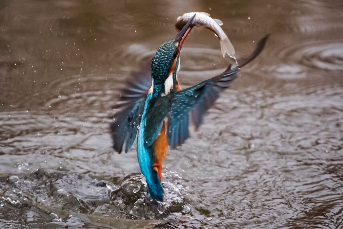Der schlanke Körperbau des Eisvogels, kombiniert mit speziellen Federn, ermöglicht ihm ein nahezu spritzfreies Eintauchen ins Wasser. Seine wasserabweisenden Federn halten ihn trocken, während seine kurzen, kräftigen Flügel für schnelle Beschleunigung sorgen. Beim Tauchen schützt eine durchsichtige Nickhaut seine Augen, sodass er unter Wasser klar sehen kann. Diese Anpassung erlaubt es ihm, selbst in trübem Wasser oder bei Wellengang erfolgreich zu jagen.